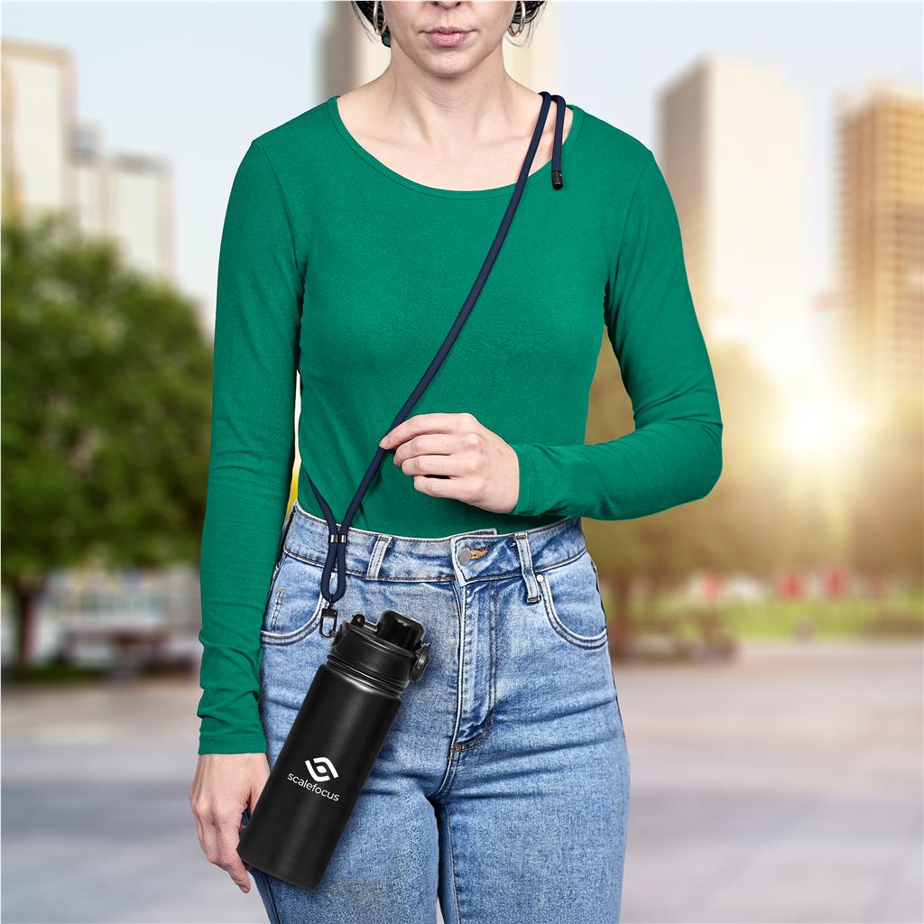 The innovative swig or sip lid design of this water bottle gives you two drinking options: hold it upright to sip through the built-in straw, or tilt back to swig through the drinking port opening. The lid also has a clip-lock mechanism to keep it watertight when not in use, but easy to pop open when you need to hydrate. Unscrewing the lid from the base reveals a wide mouth, which makes it easy to load ice or fruit into your water. The adjustable, clip-on crossbody strap enables you to carry your bottle hands-free. The bottle base is made from strong and durable BPA-free stainless steel with a black powder-coated finish. It has a double-wall vacuum construction, which ensures that liquids inside stay hot or cold for hours.
